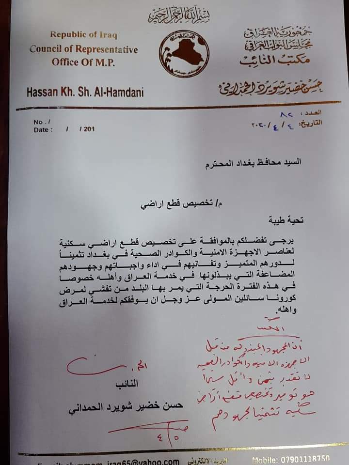 بالوثيقة موافقة محافظ بغداد محمد العطا على تخصيص اراض للاجهزة الامنية والكوادر الصحية في العاصمة.