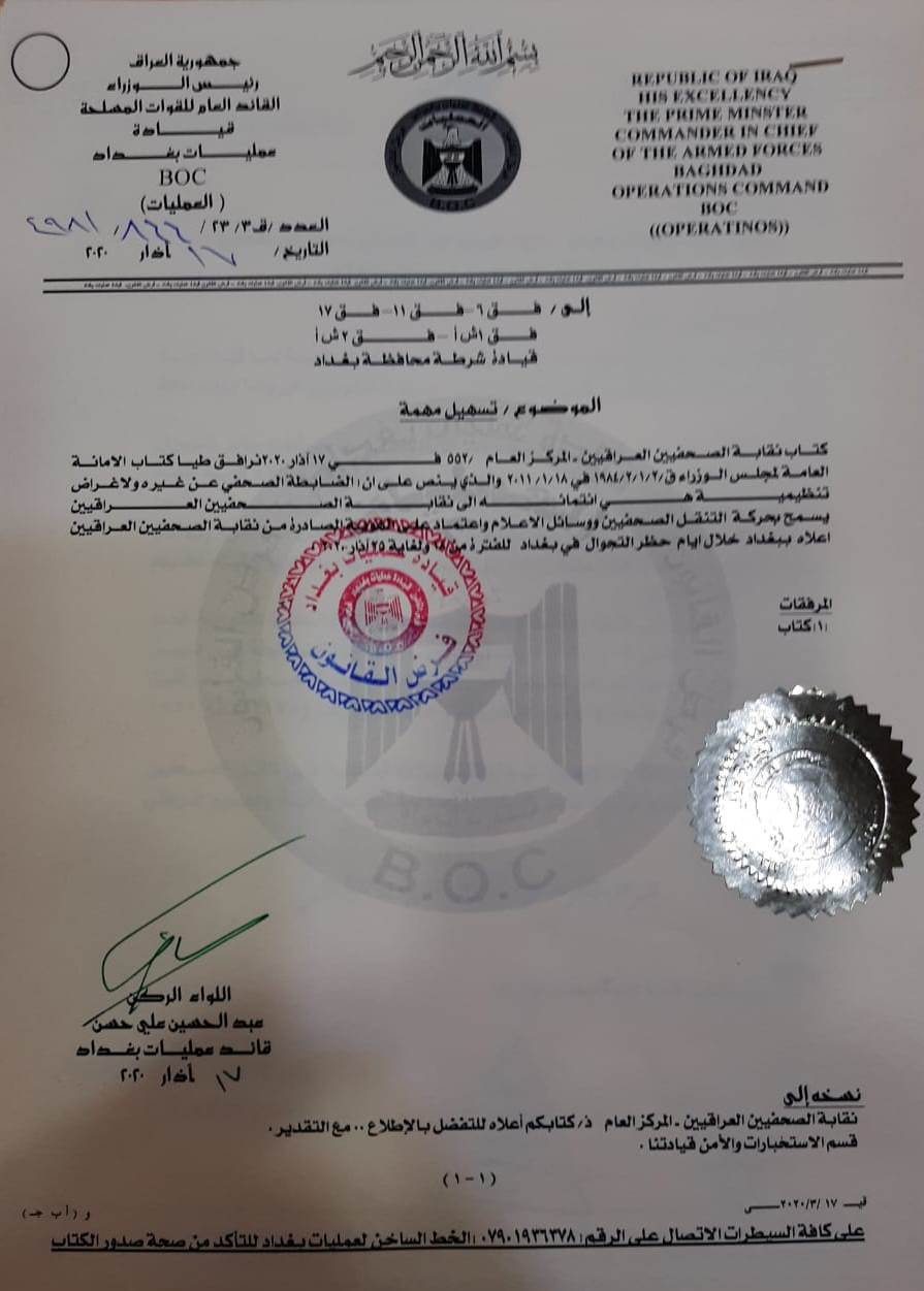 وثيقة صادرة من قيادة عمليات بغداد بشأن تنقل الصحفيين خلال ايام حظر التجوال.